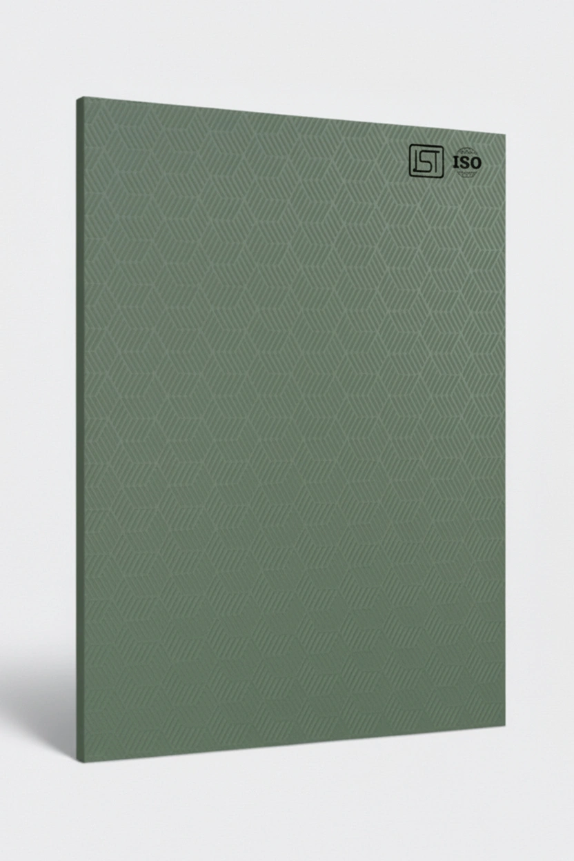 Elegant sage green colored decorative laminate featuring geometric 3D grooves texture laminate in matt finish perfect for modern interiors.