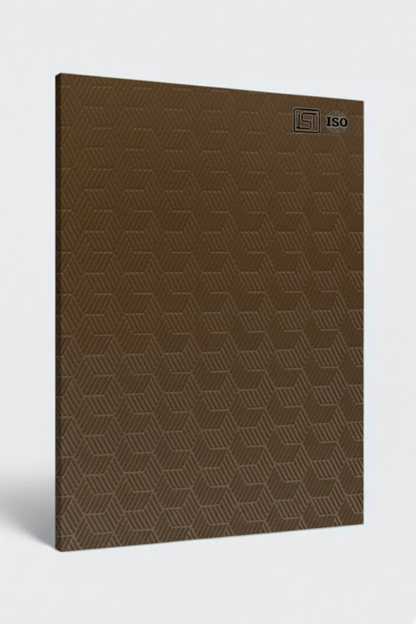 Luxurious deep mocha brown colored decorative laminate featuring geometric 3D grooves texture in matt finish perfect for modern interiors.