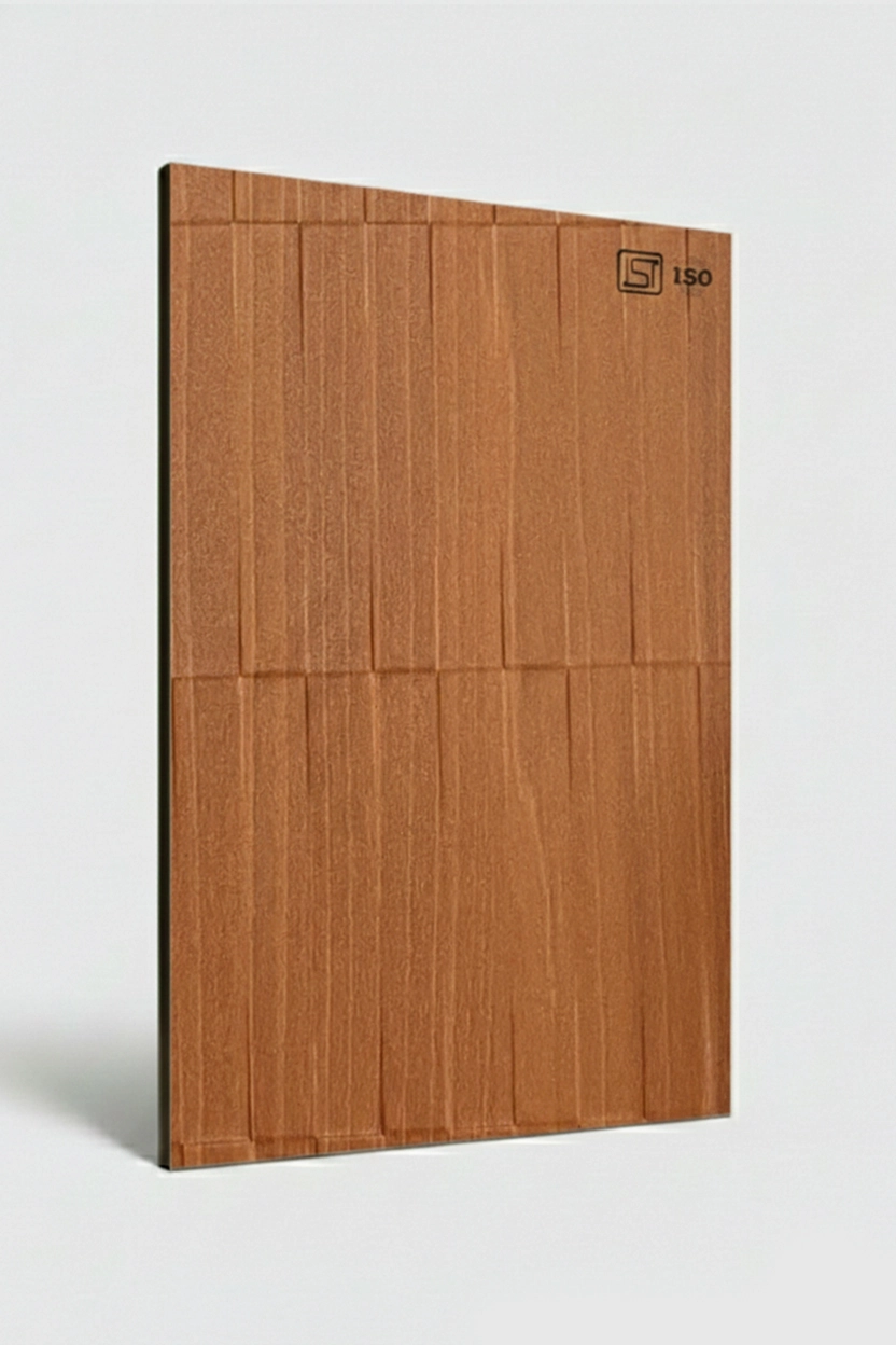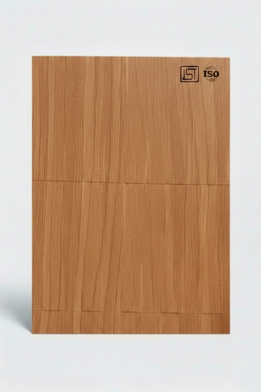 Elegant teak brown colored decorative laminate featuring a wooden patterned texture in matte finish, perfect for modern interiors.
