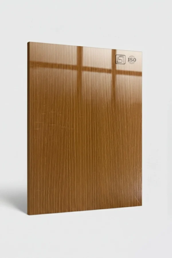 Elegant warm medium brown colored decorative laminate featuring a wooden texture in a high-gloss finish, perfect for modern interiors.
