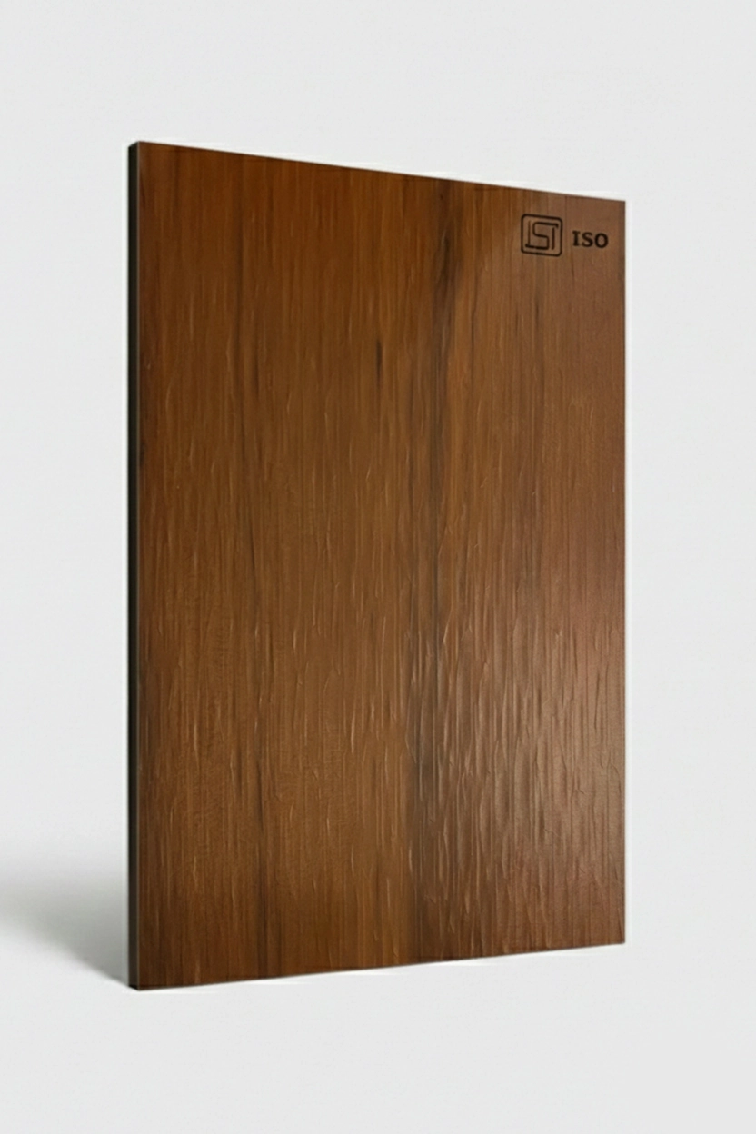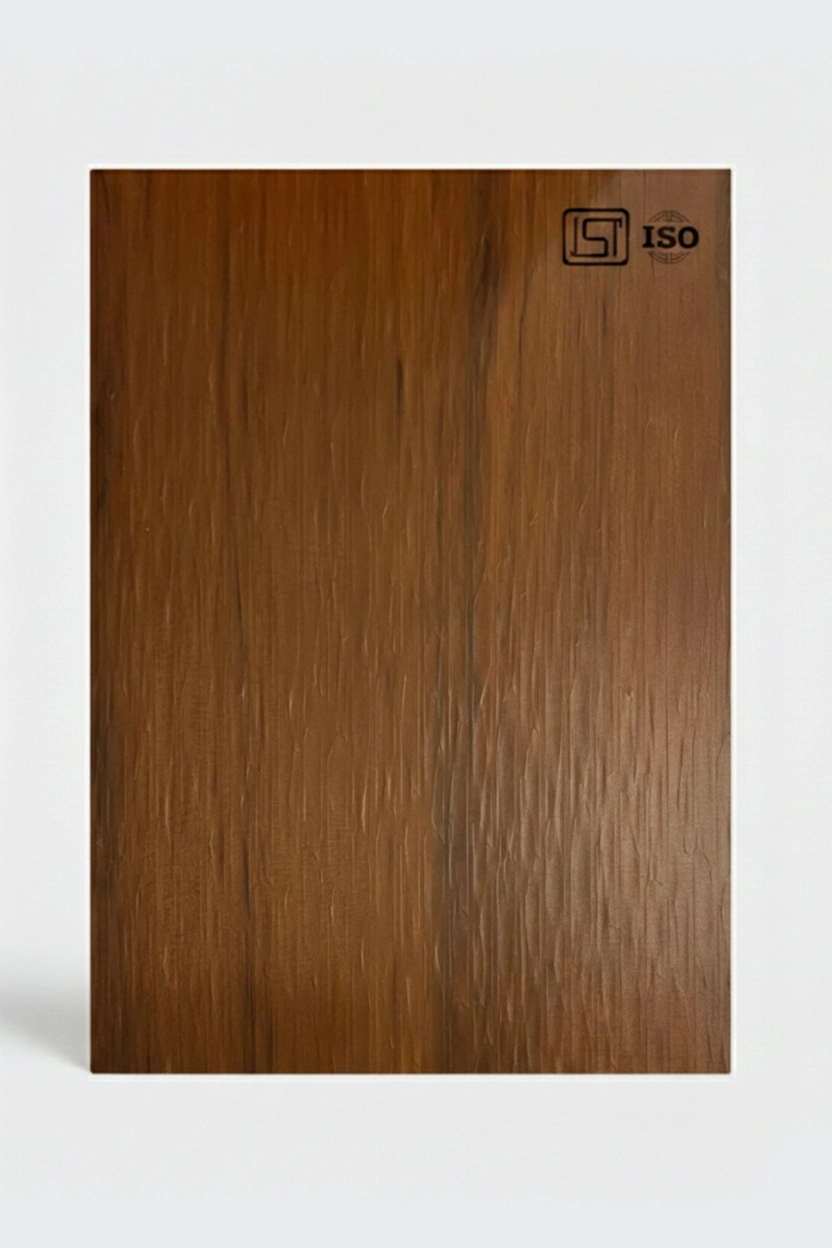 Elegant classic brown teak colored decorative laminate featuring a wooden texture in matte finish, perfect for modern interiors.