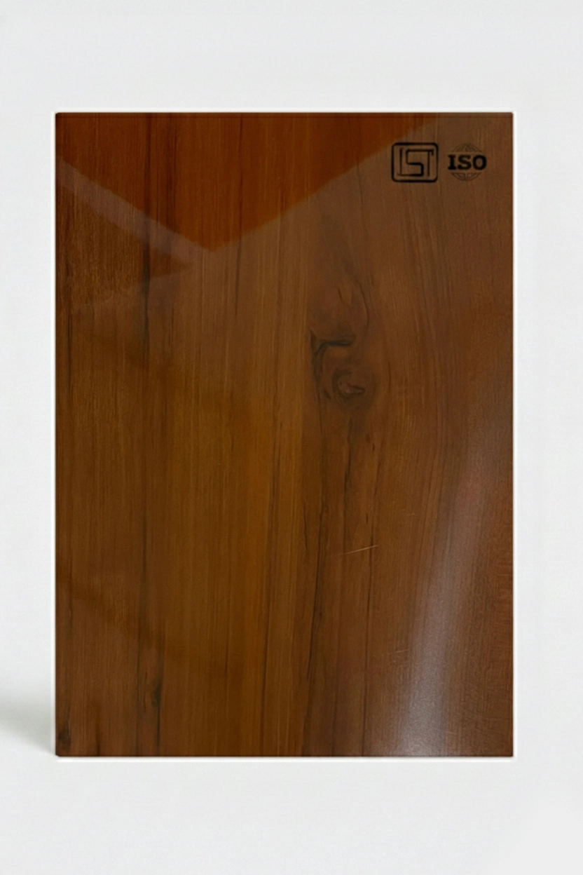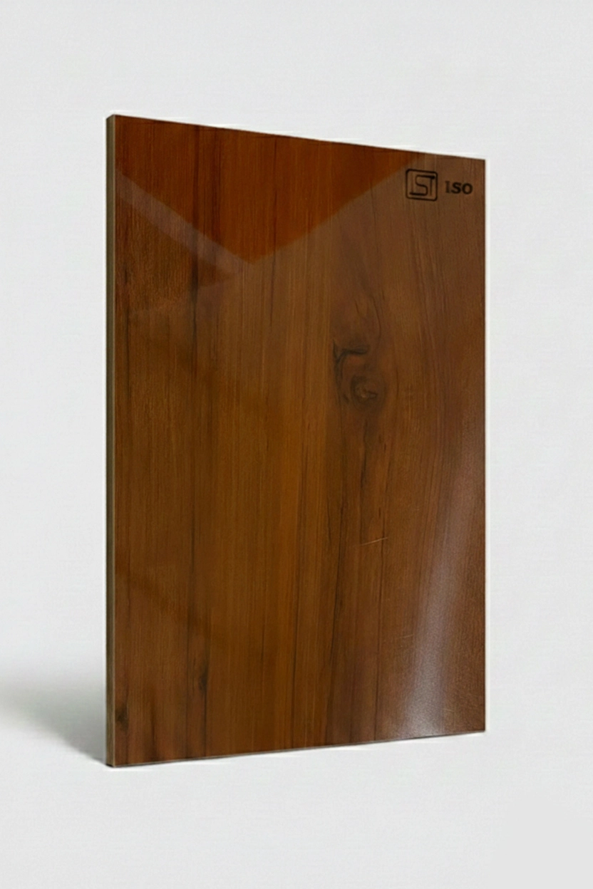 Elegant classic brown teak colored decorative laminate featuring wooden texture in a high-gloss finish, perfect for modern interiors.