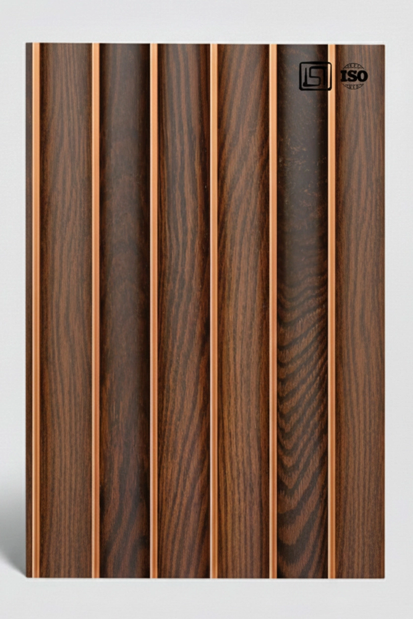 Luxurious double tone dark brown and medium light brown oak premium wooden louver panel featuring fluted texture with linear design in matt finish, perfect for modern interiors.