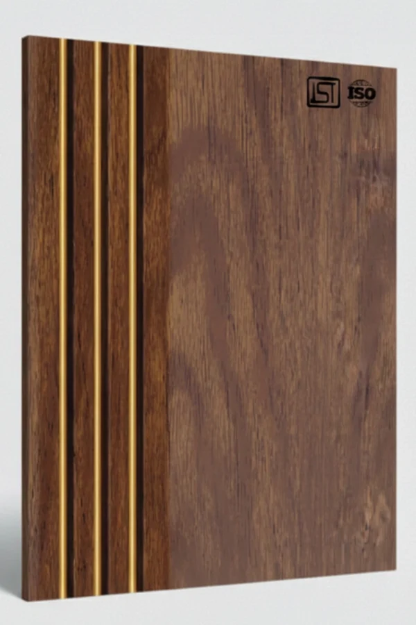 Luxurious dark walnut premium wooden louver panel featuring fluted texture with golden metallic linear design in matt finish, perfect for modern interiors.