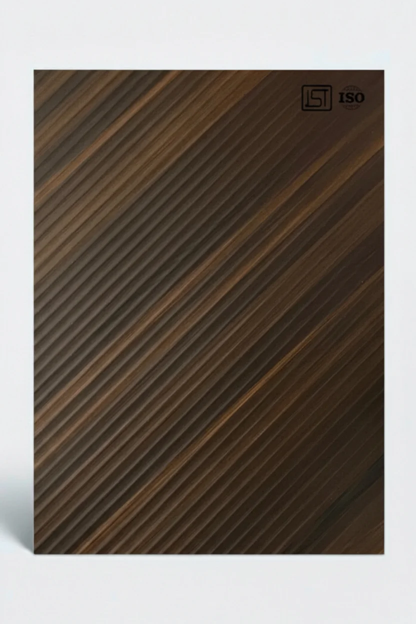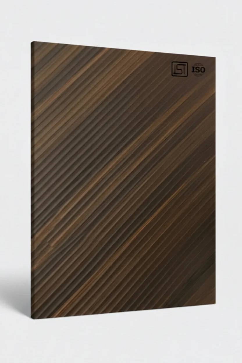 Luxurious smoky walnut colored decorative laminate featuring diagonally fluted texture in matt finish, perfect for modern interiors.