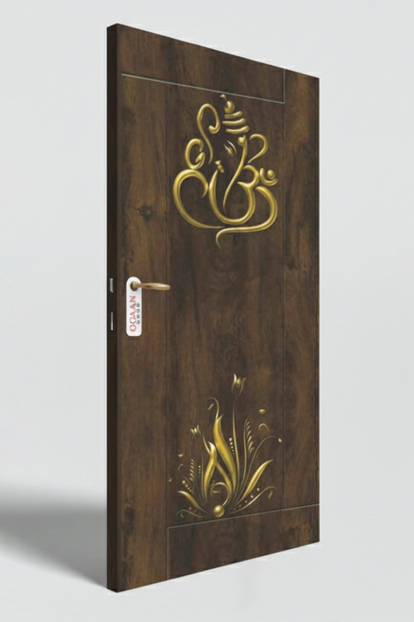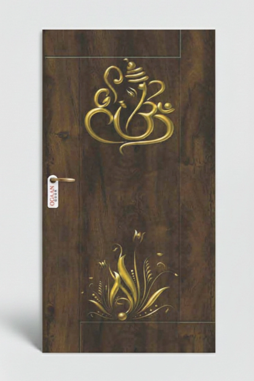 Luxurious classic wenge brown colored digital door skin laminate featuring smooth wooden texture with gold metallic ganesha design in matt finish, perfect for modern interiors.