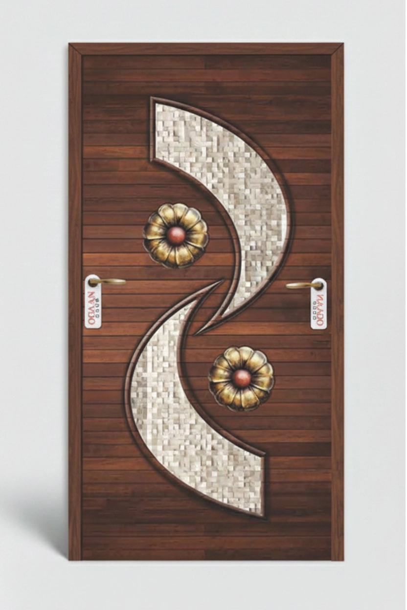 Luxurious natural brown walnut colored digital door skin laminate featuring smooth wooden texture with royal antique design in matt finish, perfect for modern interiors.