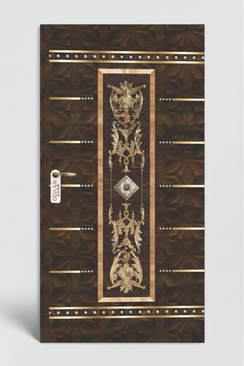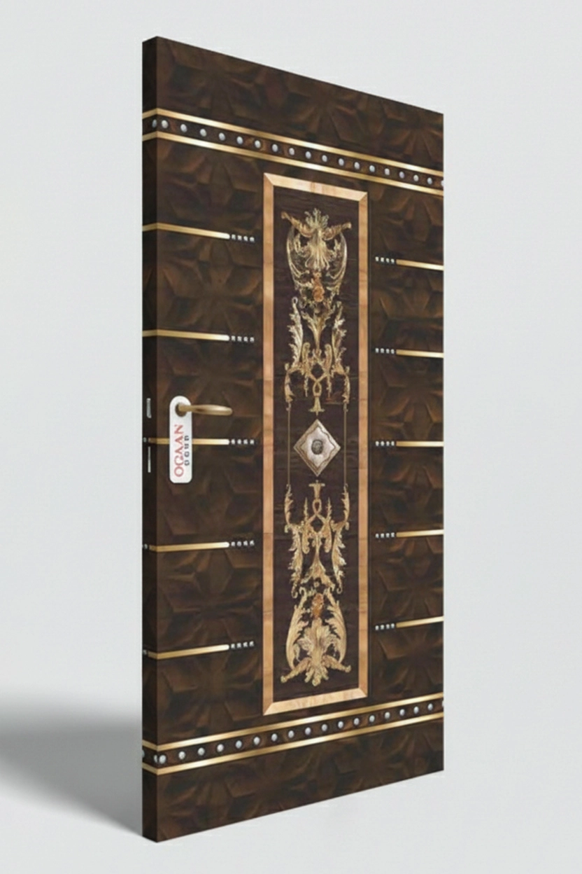 Luxurious classic dark brown colored digital door skin laminate featuring smooth wooden texture with gold metallic royal design in matte finish, perfect for modern interiors.