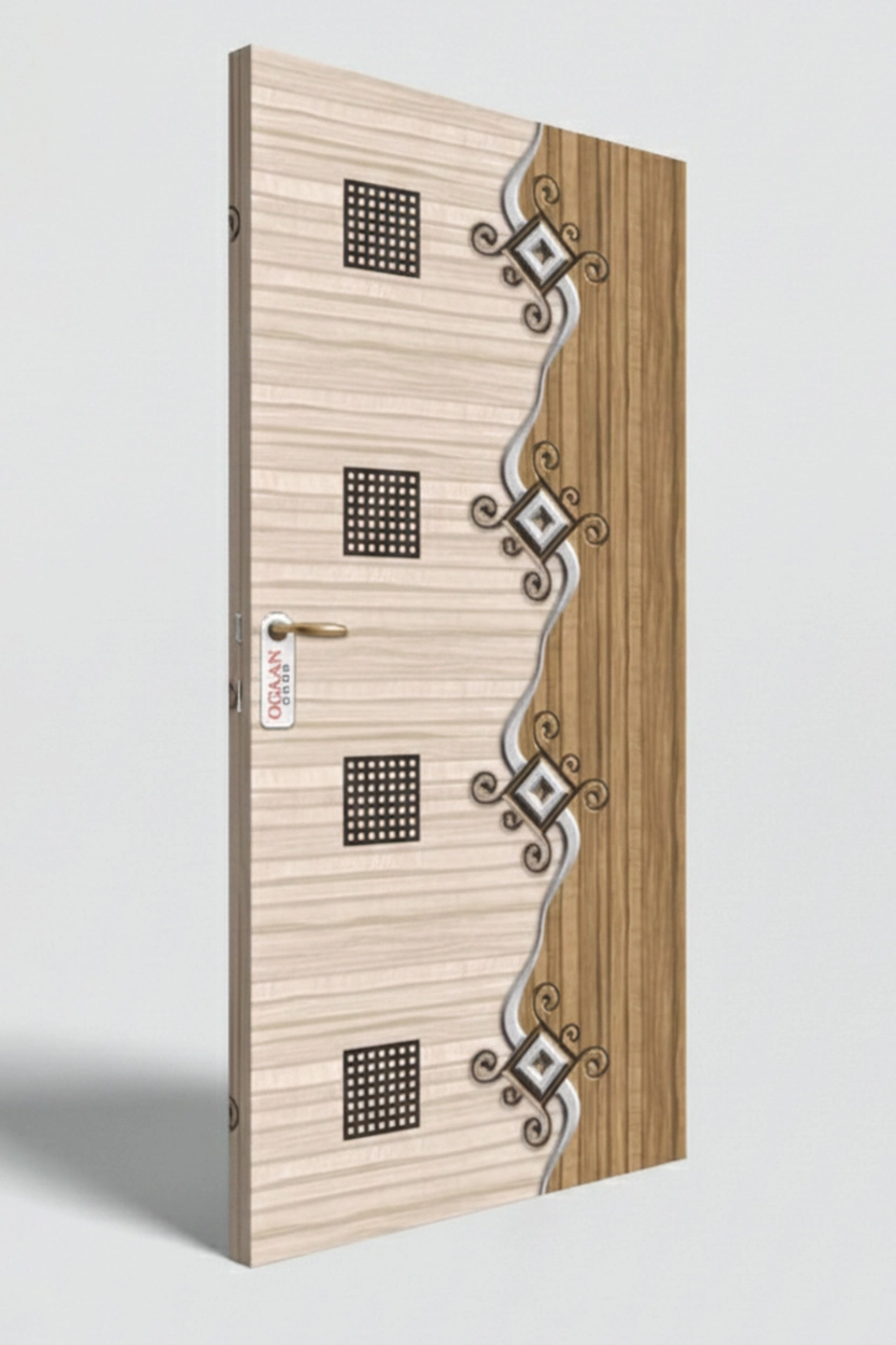 Luxurious dual tone beige teakwood and natural oak colored premium door skin laminate featuring a smooth natural looking wooden texture and unique design in matte finish, perfect for modern interiors.